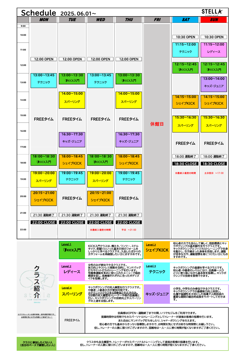 いつもSTELLA-EBISUをご利用いただき誠にありがとうございます。 6月からKICK入門クラスが新たに加わり、スケジュールが変……