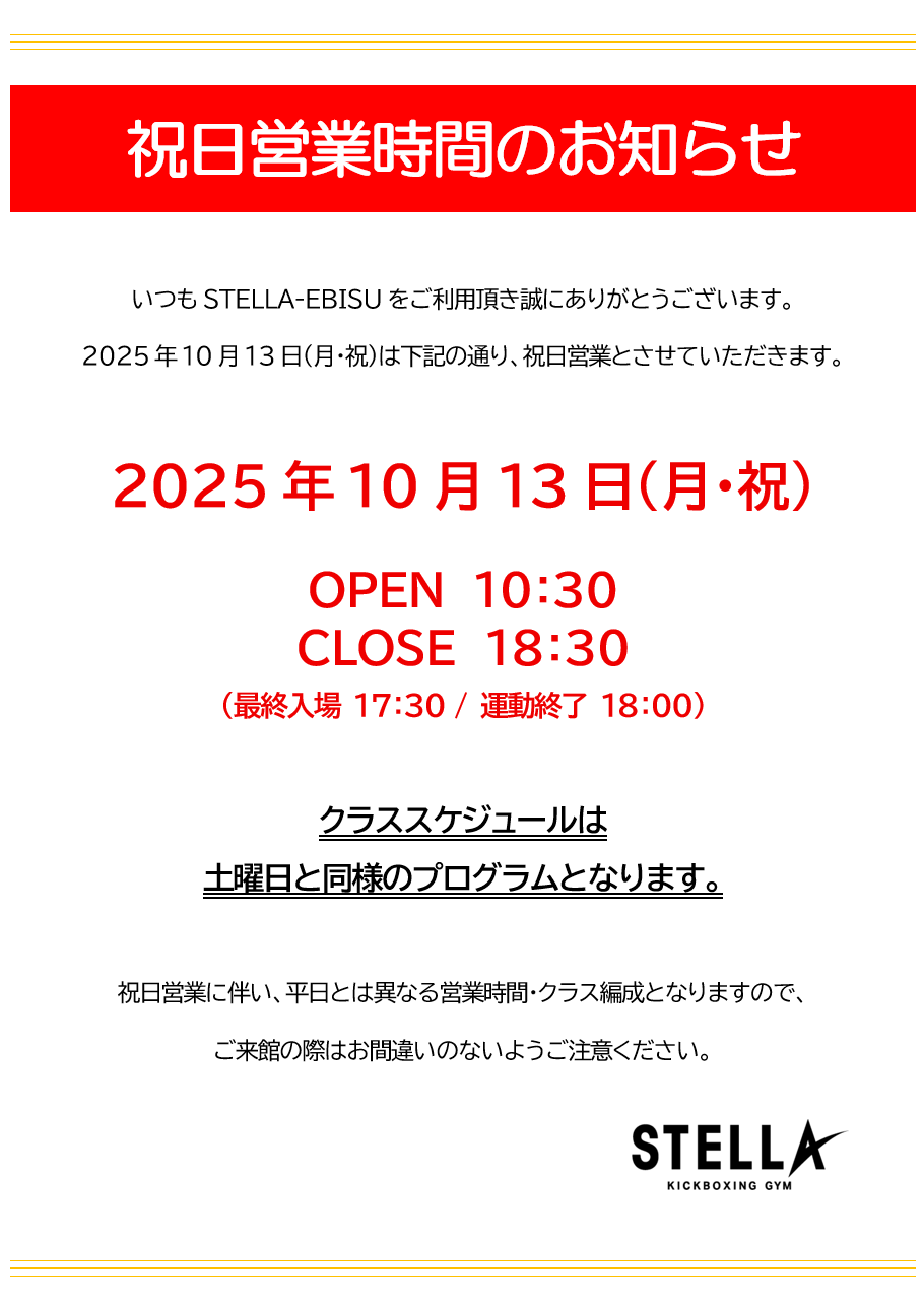 祝日営業のご案内 DATE ----- 2025.10.7 いつもSTELLA-EBISUをご利用いただき誠にありがとうございます。 2025年10月13日(月)は祝日のため、営業時間が上記の…… more >>>