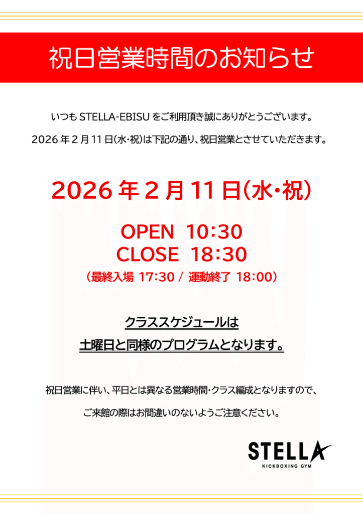 いつもSTELLA-EBISUをご利用いただき誠にありがとうございます。 2026年2月11日(水)は祝日のため、営業時間が上記の通りと……